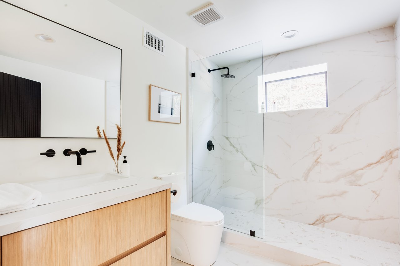 A refined, minimalistic, and modern home located in the prestigious area of Altadena at 1734 E Loma Alta offers contemporary elegance. Built in 1947 on 0.37 of an acre, this fully remodeled home boasts 3,950 square feet of interior living with sleek style and functionality from Japanese and Scandinavian influences. A dramatic custom stairwell guides the way to the front entry, leading into a formal sitting area with a custom see-through gas fireplace, airy hemlock plank vaulted ceilings, and designer white oak built-in cabinetry. The open floor plan flows into a generous living and dining space, with ample natural light from incredible floor to ceiling Fleetwood pocketing doors that lead to a large balcony, creating the epitome of indoor-outdoor California living! Thoughtfully-placed skylights offer even more natural lighting in the kitchen, where custom cabinetry provides extensive yet camouflaged storage, as well as an oversized kitchen island with eat-in space for casual dining. The main floor continues with 3 bedrooms and 3.5 baths, including a distinguished primary suite with a private balcony, large walk-in closet, gas fireplace, vaulted ceilings, access to the two-car garage, and oversized en suite bathroom with dual vanity, dual showers, and oversized soaking tub. The front-facing bedroom offers a large closet and full en suite bath. The second primary bedroom boasts a full en suite bath and a connected balcony that shares stunning pool and city views. The lowermost floor features a large multipurpose room with a cozy fireplace as well as a full guest bathroom, laundry room, storage, and large guest bedroom that leads to the luscious grassy backyard. Enjoy your private oasis with a brand new bean-shaped built-in pool, patio, and pool house with a convenient bathroom and storage. You'll never want to leave, so luckily this home is just a short commute to dining, shopping, and the Altadena crest mountain trail.